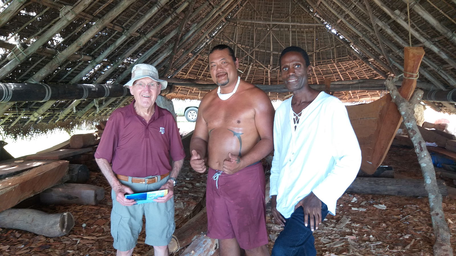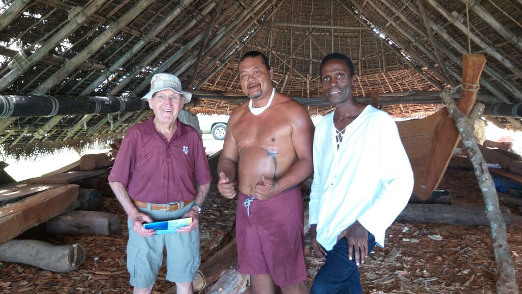 Alex Dunn, former United Airlines pilot of 32 years and one-time pilot of the lone, operational B-29 used by the Commemorative Air Force for traveling air shows, recently visited Saipan for DiscoverSaipan.com’s World War II Pilgrimage tour. Dunn is seen here with John S. Castro-Mames, project coordinator of the Seafaring Traditions Program in Susupe along with author/guide Walt F.J. Goodridge.
