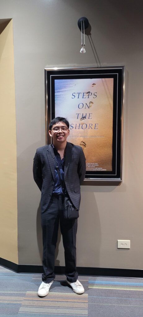 Filmmaker Elijah Joshua Pajarillaga poses for a photo in front of the poster for his new film, “Steps on the Shore,” which premiered at Hollywood Theaters on Monday night.