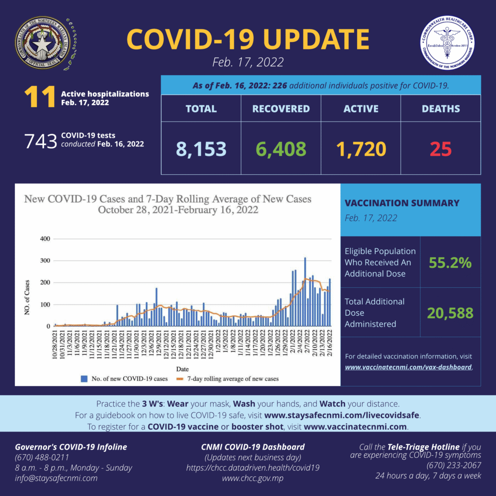 A total of 60 Covid-19 vaccine shots were administered on Feb. 17, 2022; of the eligible population, 55.2% have received an additional dose. The vaccination rate is calculated using the 2020 Census population estimates for the CNMI and includes the eligible 5-year-olds and older population.