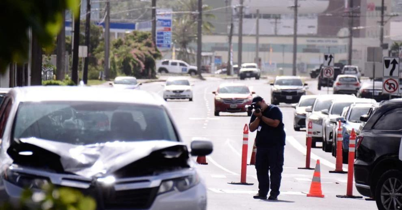 A Guam Police Department officer takes photos at the scene of a collision involving an automobile and a pedestrian on Feb. 12, 2023, in Tamuning.