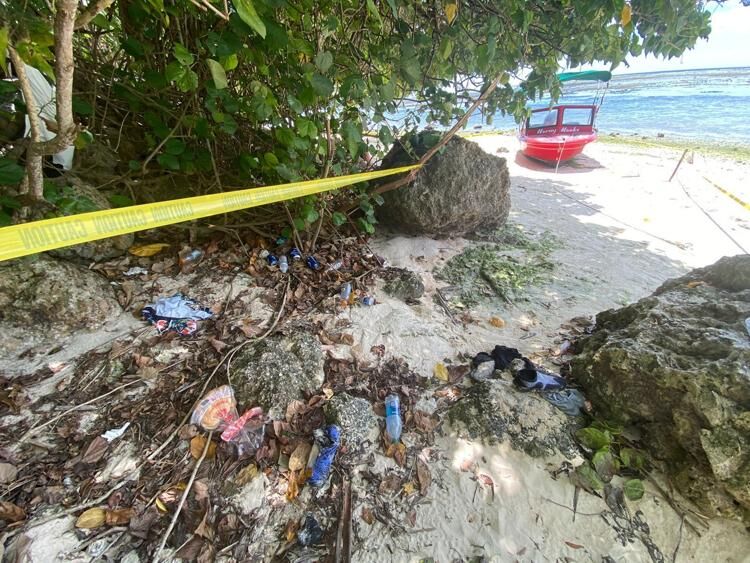 Swimwear and food and drink containers are seen discarded near the area where an abandoned boat is marked with caution tape in Tumon Bay on July 6. Officials said the vessel is one example of evidence of increased illegal entry into Guam.