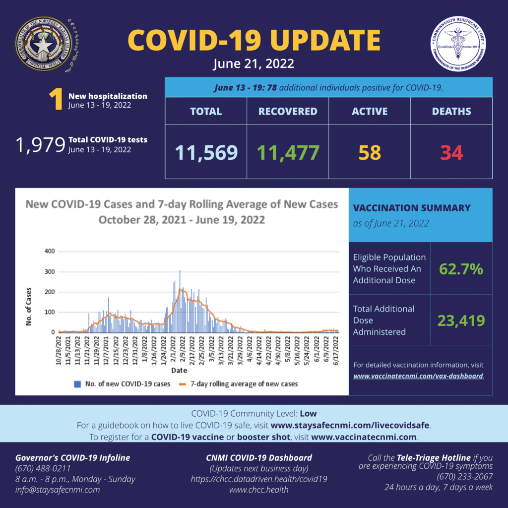 CHCC said 78 additional individuals had been confirmed positive for Covid-19, bringing the CNMI total to 11,569 cases since March 28, 2020. Nine additional cases were identified on June 11 – 12, 2022.