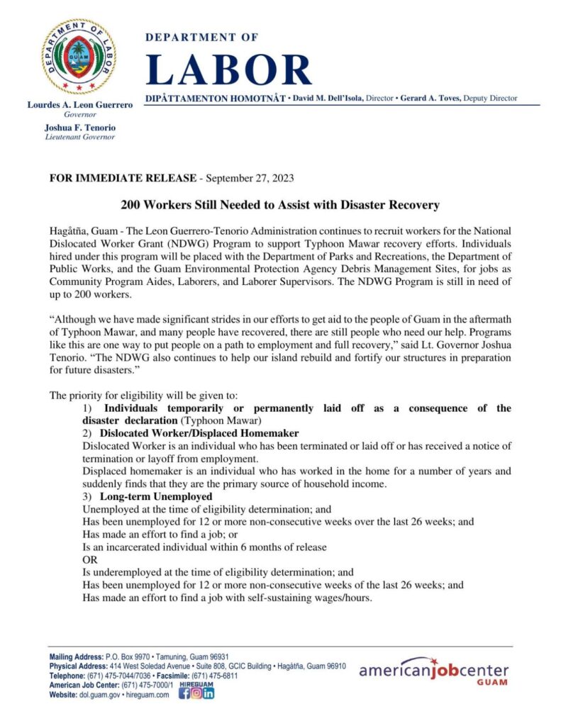 Guam Department of Labor — The Leon Guerrero-Tenorio Administration continues to recruit workers for the National Dislocated Worker Grant (NDWG) Program to support Typhoon Mawar recovery efforts. Individuals hired under this program will be placed with the Department of Parks and Recreations, the Department of Public Works, and the Guam Environmental Protection Agency Debris Management Sites, for jobs as Community Program Aides, Laborers, and Laborer Supervisors. The NDWG Program is still in need of up to 200 workers.