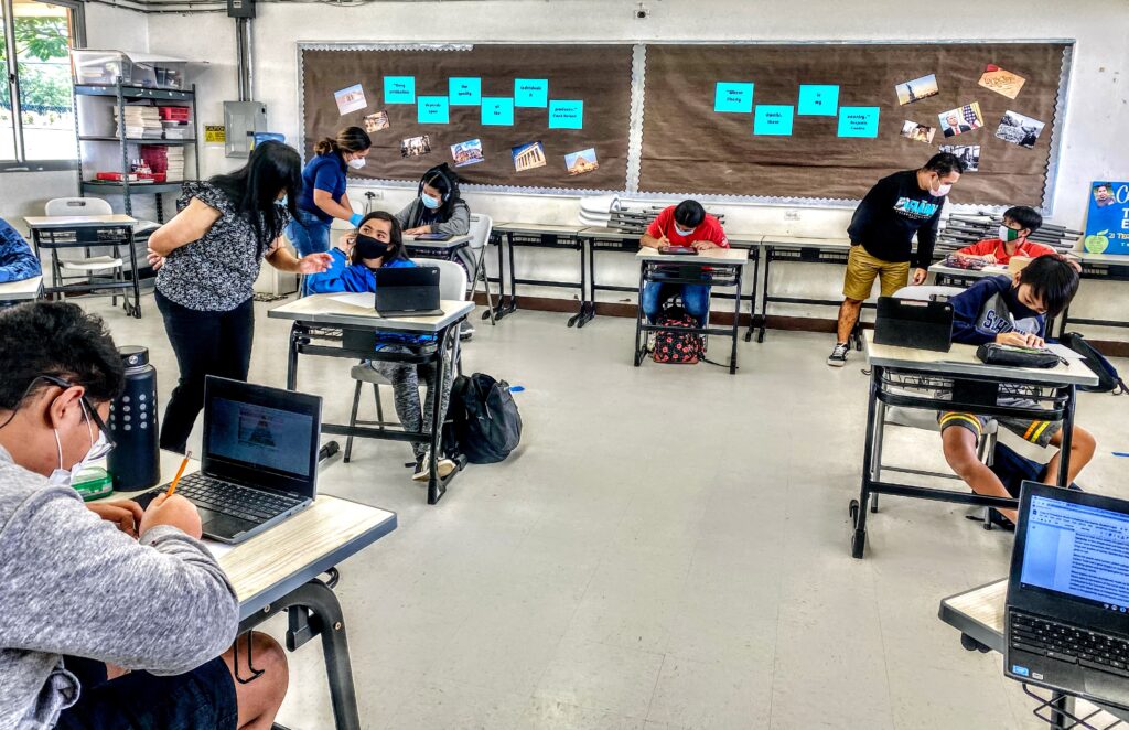 Social studies teacher Tyron Ermang, right standing, of Tanapag Middle School talks to one of his eighth-grade students Thursday. Also in photo are special education teacher aide Carmina Pua and school principal Hilda Rios who are also providing guidance to students. On Dec. 28, 2021 Ermang was one of the eight classroom teachers who received the 21st Century Educator Award for his “outstanding contributions to the academic achievement and personal growth of learners” with the “use and promotion of educational technology.”