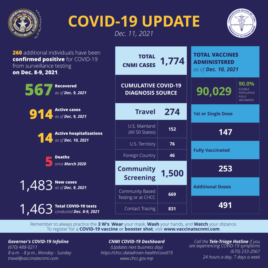 A total of 891 Covid-19 vaccine shots were administered on Dec. 10, 2021, resulting in 90% of the CNMI’s eligible population being fully vaccinated, which affords the community more protection against severe illness, hospitalization, and death.