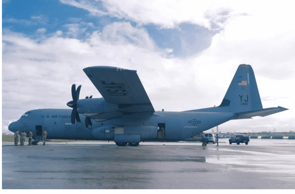 A C-130 Hercules is seen during Operation Christmas Drop 2023 on Tuesday, Dec. 5, 2023, at Andersen Air Force Base.