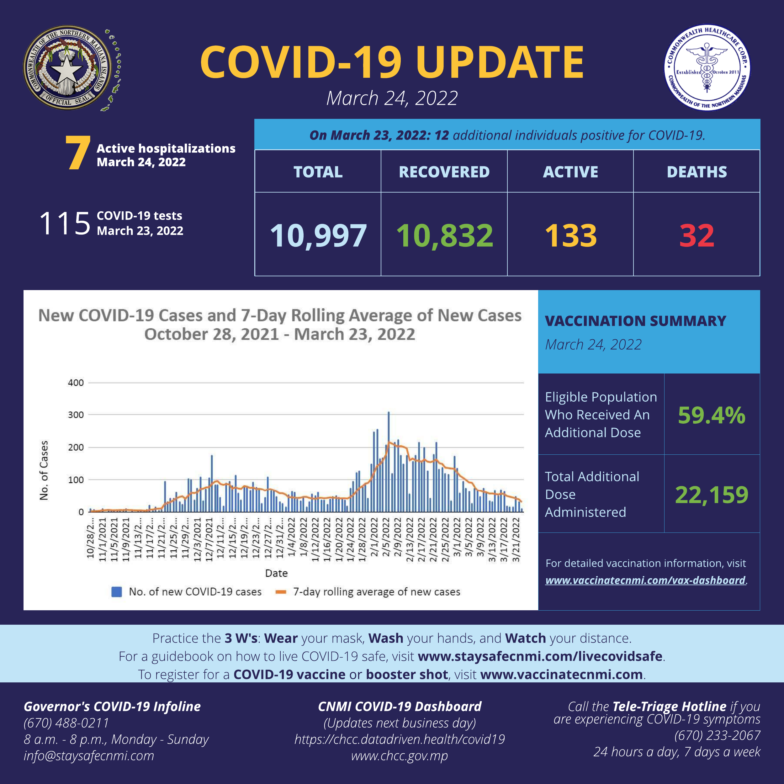 A total of 45 Covid-19 vaccine shots were administered on March 24, 2022. Of the eligible population, 59.4% have received an additional dose. The vaccination rate is calculated using the 2020 Census population estimates for the CNMI and includes the eligible 5-year-olds and older population.