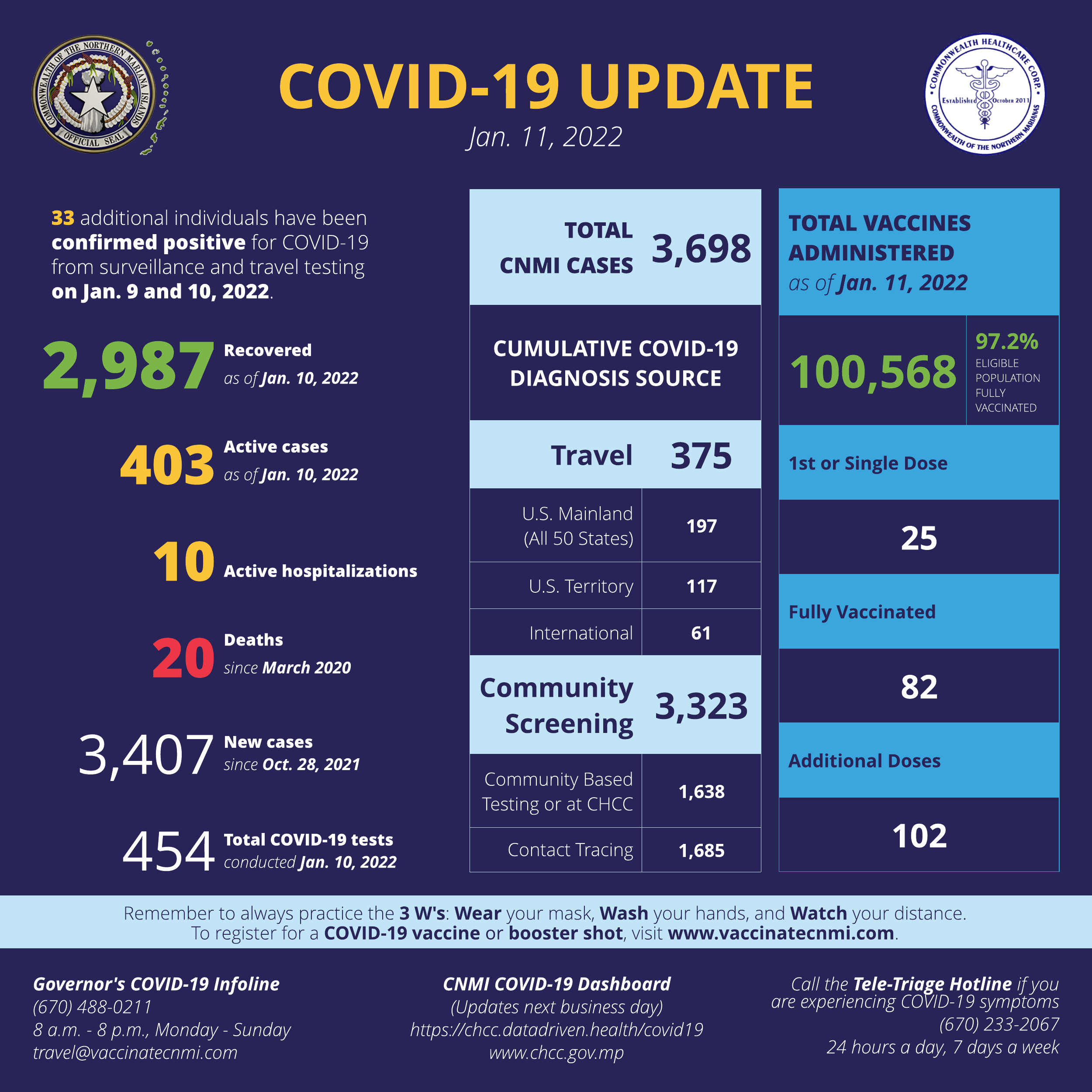 (CHCC) — Thirty-three additional individuals have been confirmed positive for Covid-19, bringing the CNMI total to 3,698 cases since March 28, 2020. The individuals have been isolated and are actively monitored.