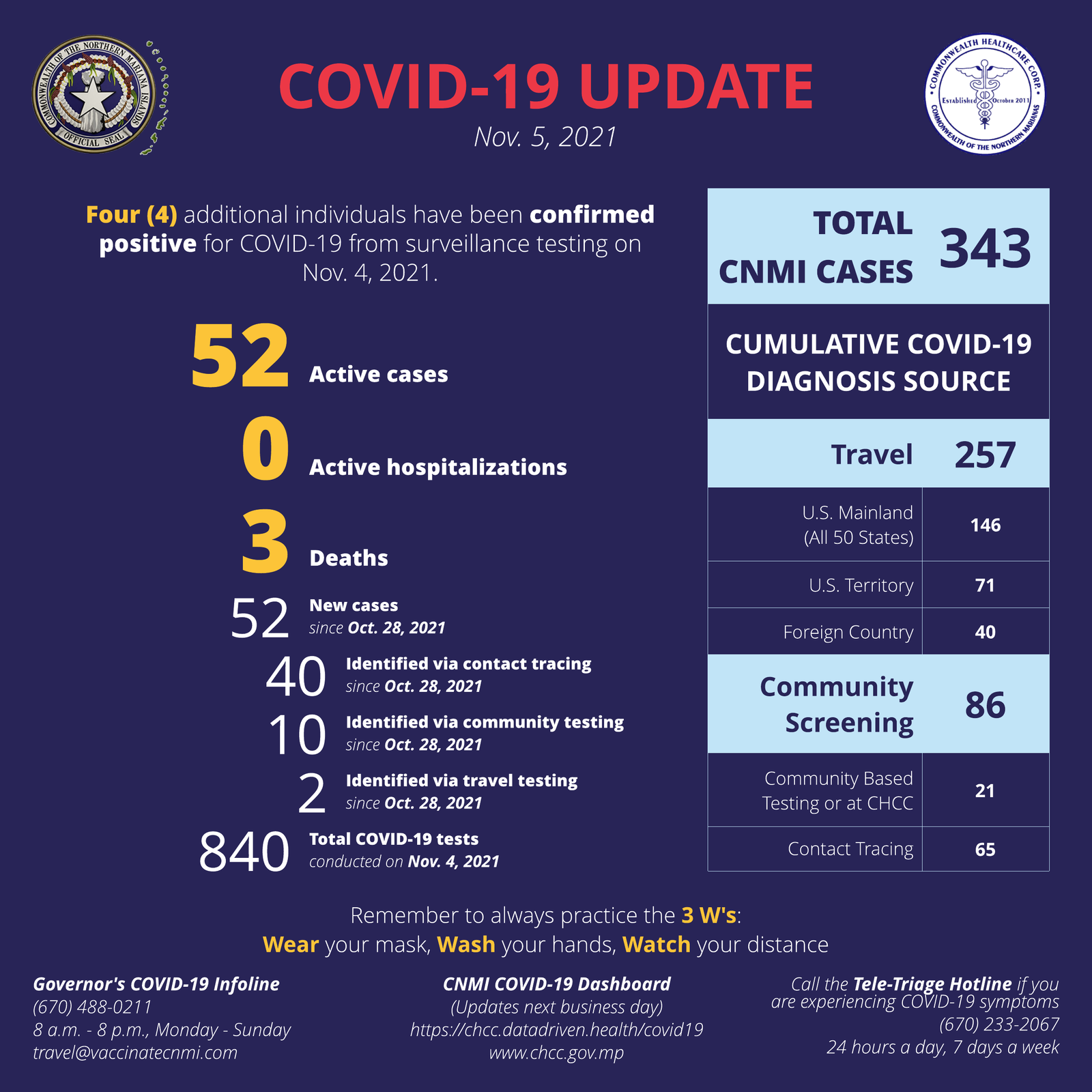 (Commonwealth Healthcare Corp.) — Four additional individuals have been confirmed positive for Covid-19. This brings the CNMI total to 343 cases since March 28, 2020.
