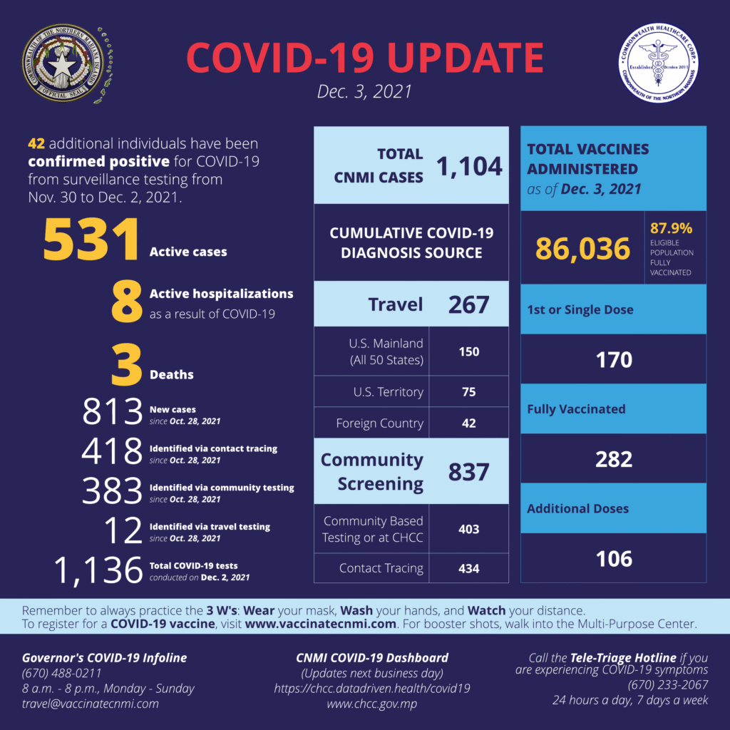 A total of 558 Covid-19 vaccine shots were administered on Dec. 3, 2021, resulting in 87.9% of the CNMI’s eligible population being fully vaccinated, which affords the community more protection against severe illness, hospitalization, and death.