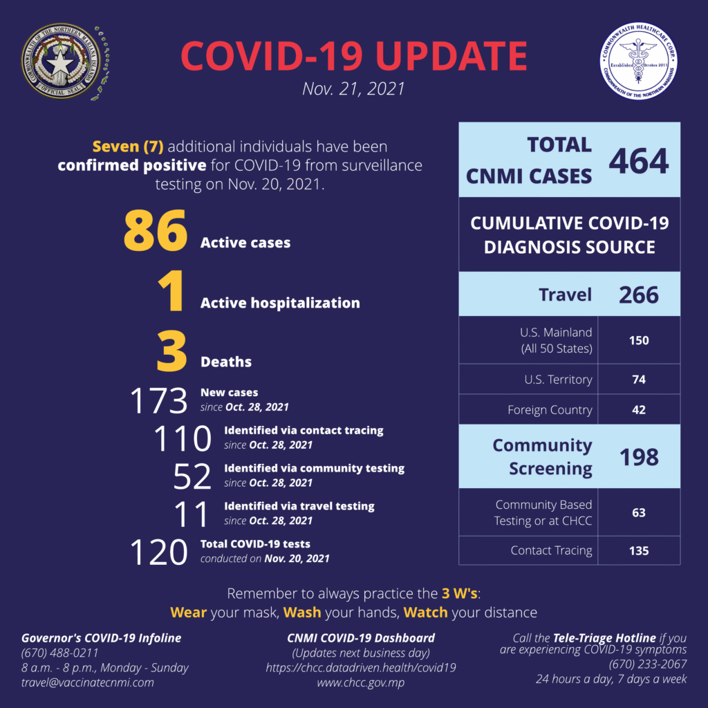 (CHCC) — Seven additional individuals have been confirmed positive for Covid-19. This brings the CNMI total to 464 cases since March 28, 2020.