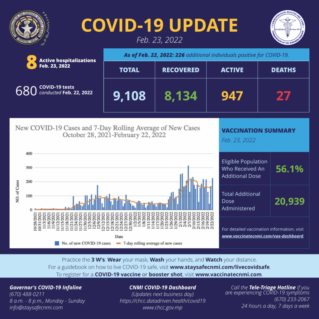 226 additional individuals have been confirmed positive for Covid-19, bringing the CNMI total to 9,108 cases since March 26, 2020, CHCC reported Wednesday evening.