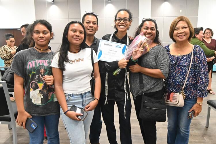 Chanice Guevara, fourth from left, is joined by family for a photo after receiving her completion certificate at the Guam Community College Construction Boot Camp IV completion ceremony Monday, Oct. 30, 2023, at the GCC campus in Mangilao.