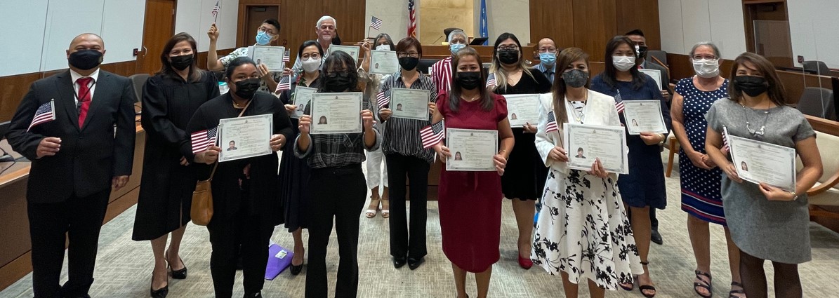 In the morning session, the following new U.S. citizens were sworn in: Aileen Mendoza-Agana, Momrej Bhuiyan, Edelina Herrera Borja, Giselle Adlawan Butalid, Ponciano Pascua Corotan, Elisa Mariquit Cuaresma, Joselito Narag Golingo, Alexander Sison Gozon, Elizabeth Sanchez Gozon, Zenaida Degracia Hernandez, Hyung Jin Kim, Francia Copino Manait, Adelita Hayagan Molina, Femie Yesca Rey, Kyeong Hee Seo, Alexander Vekhov, Lolita Endaya Velasco, and Zhanru Yin.