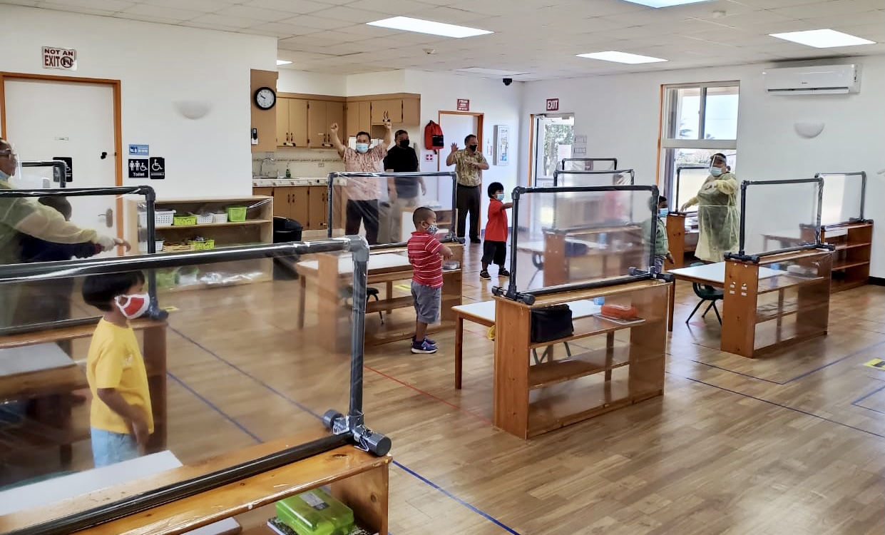 Newly elected Board of Education Chairman Andrew L. Orsini, Commissioner of Education Dr. Alfred B. Ada and Associate Commissioner for Administrative Service Eric Magofna, in the background, visited various Tinian public school facilities Thursday. Photo shows children with the Tinian Head Start/Early Head Start Program participating in a classroom activity. Their learning space has been reconfigured to reflect the safety measures implemented to protect all public school students and personnel from the threat of Covid-19. The Public School System says it will continue to ensure the safety of all its schools.