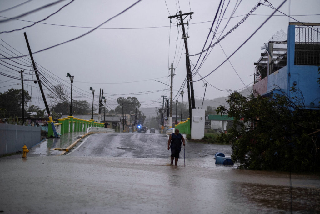 A man wades through a flooded street after Hurricane Fiona affected the area in Yauco, Puerto Rico, Sept. 18, 2022.