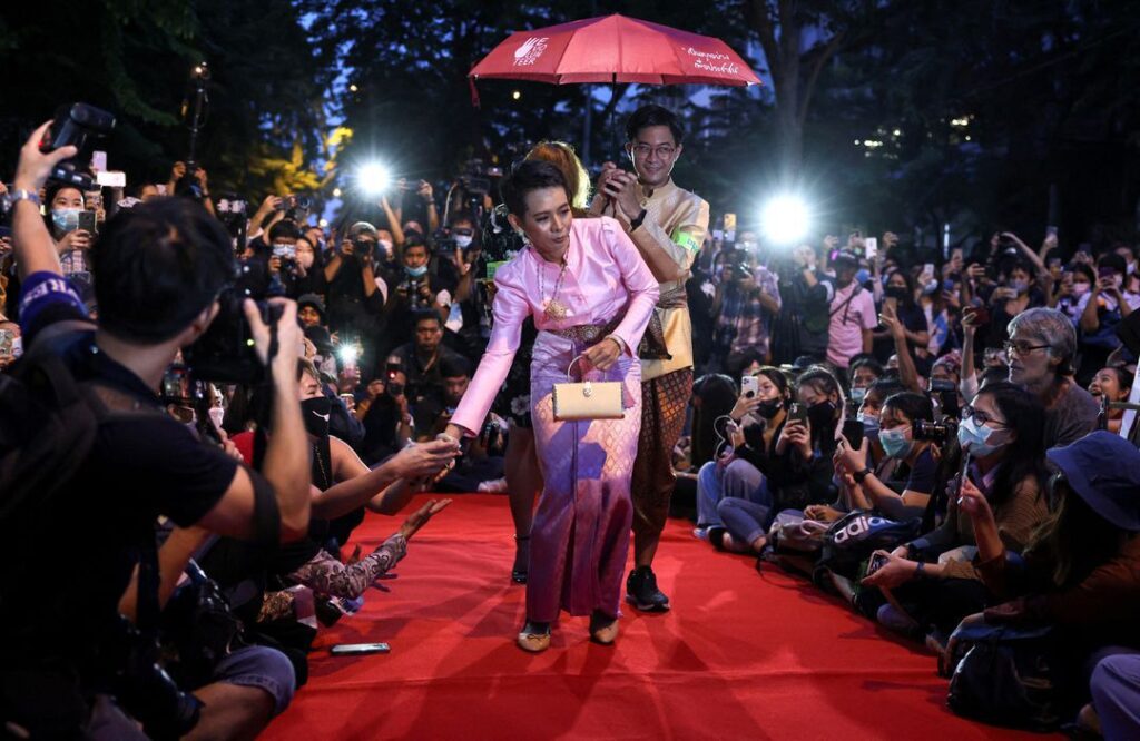Jaturporn in October 2020 walked a red carpet at a protest wearing a traditional pink silk dress shaded under an umbrella held by an attendant, while protesters sat on the ground in a manner that Thai traditional culture demands in the presence of royalty.