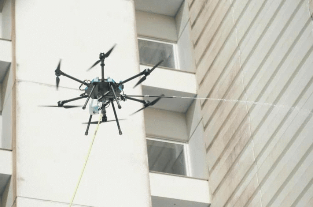 Bella Wings Aviation’s “Lucid” drone is employed for an “AeroBlasting” demonstration in partnership with The Westin Resort Guam and JLG HydroBlast Guam at the Tumon hotel on Wednesday, Nov. 8, 2023.