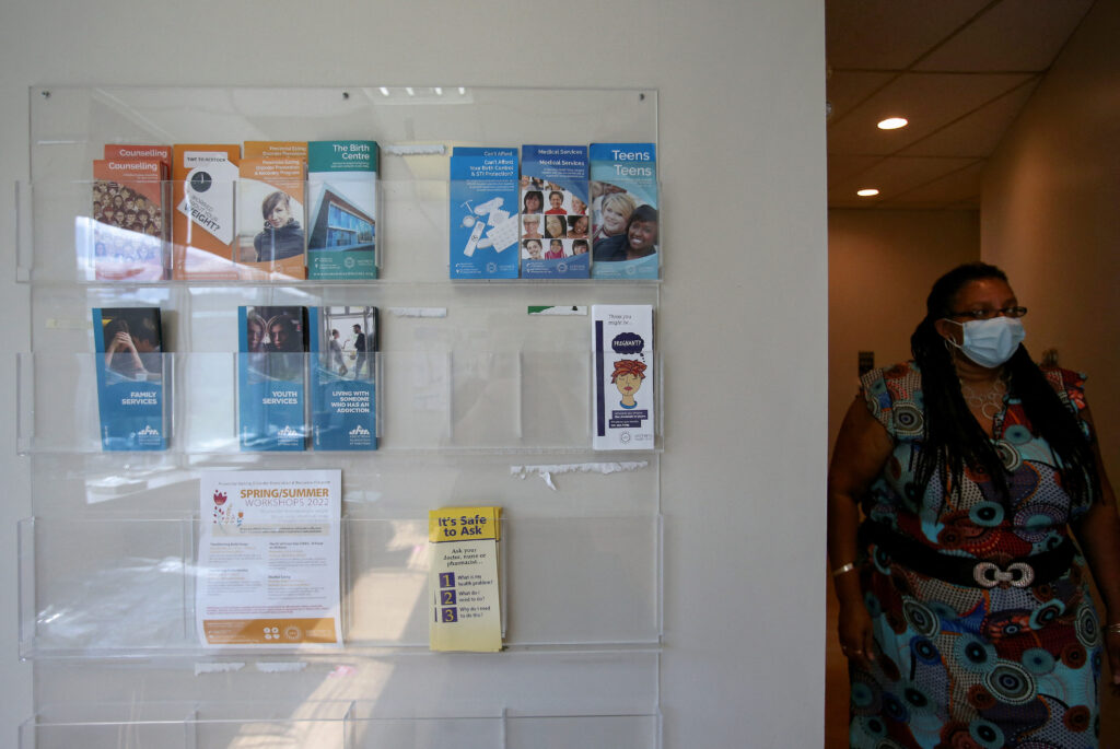 Kemlin Nembhard, executive director at the Women’s Health Clinic, which offers reproductive care, including abortions, walks next to information pamphlets at the clinic, in Winnipeg, Manitoba, Canada on June 28, 2022.