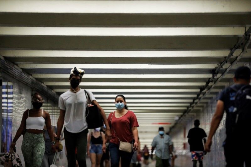 People wear masks as they pass through a pedestrian subway as cases of the infectious coronavirus Delta variant continue to rise in New York City on July 26, 2021.