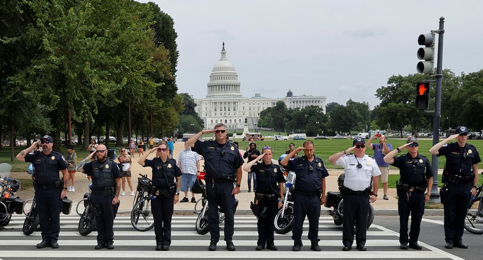 Law enforcement officers from Washington’s Metropolitan Police Department, the U.S. Capitol Police, the Pentagon Force Protection Agency and other police departments salute as a ceremonial procession in honor of a police officer wounded in a shooting at the Pentagon earlier in the day passes the U.S. Capitol in Washington, D.C. on Aug. 3, 2021.