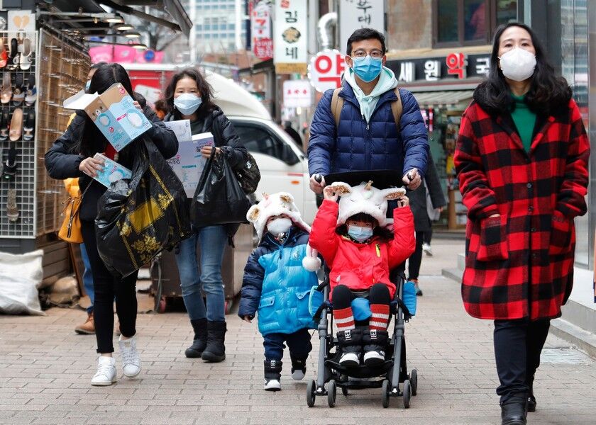 People wear masks at a shopping district in Seoul, South Korea, Tuesday. Panic and pollution drive the market for protective face masks, so business is booming in Asia, where fear of the coronavirus from China is straining supplies and helping make mask-wearing the new normal. AP