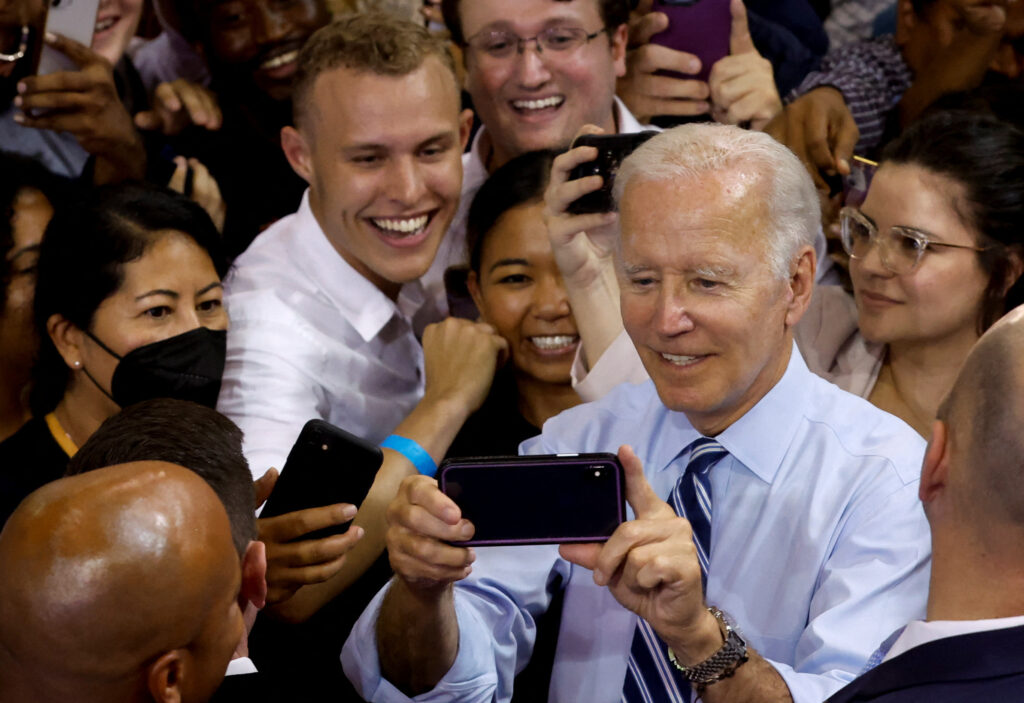 President Joe Biden takes a selfie during a Democratic National Committee rally at Richard Montgomery High School in Rockville, Maryland, Aug. 25, 2022.