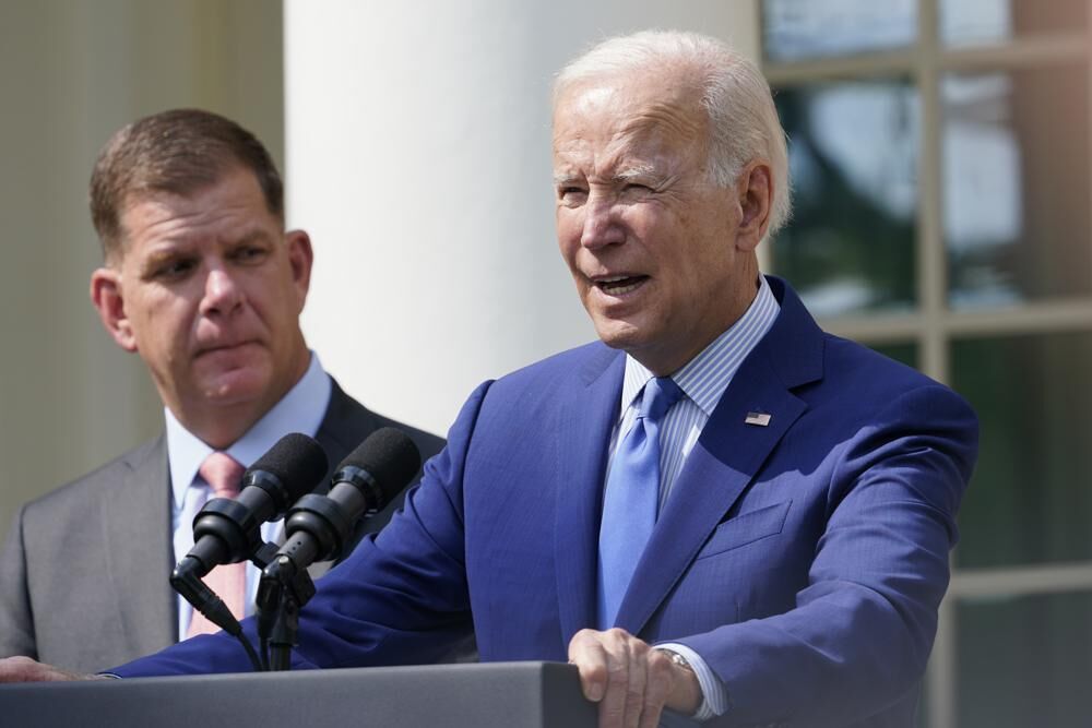President Joe Biden, with Secretary of Labor Marty Walsh, left, speaks about a tentative railway labor agreement in the Rose Garden of the White House, Thursday, Sept. 15, 2022, in Washington.