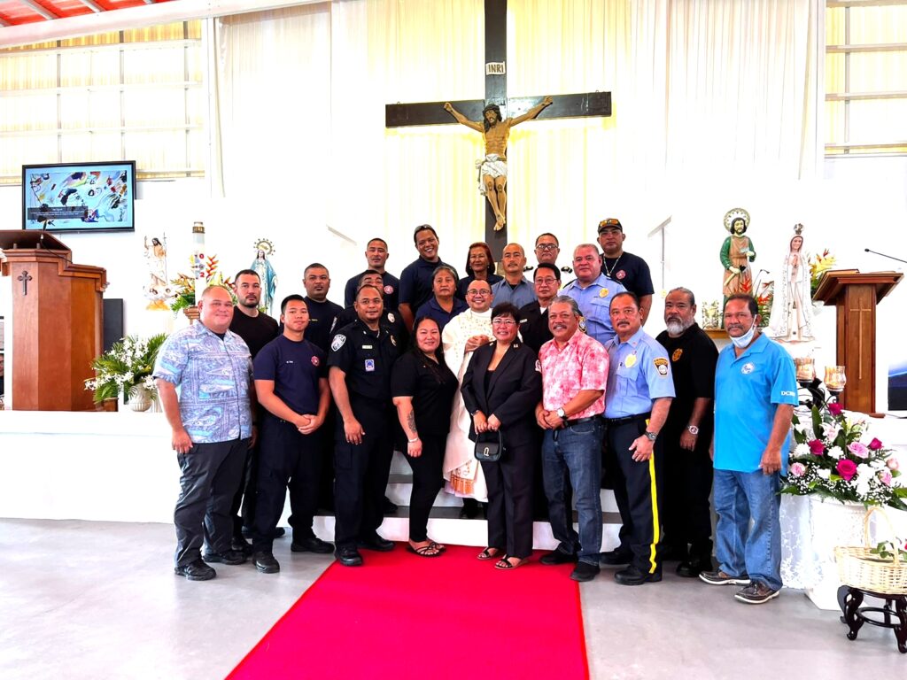Tinian Department of Public Safety celebrated Law Enforcement Blue Mass on Monday at the San Jose Parish Church with Rev. Fr. Anthony O. Aguason. Also in photo are Corrections Commissioner Wally Villagomez, Tinian DPS Resident Director Eugene Wayne Villagomez, Tinian Mayor Edwin Aldan, his wife, Customs Officer Rosita King-Aldan, police officers, and fire department first responders.