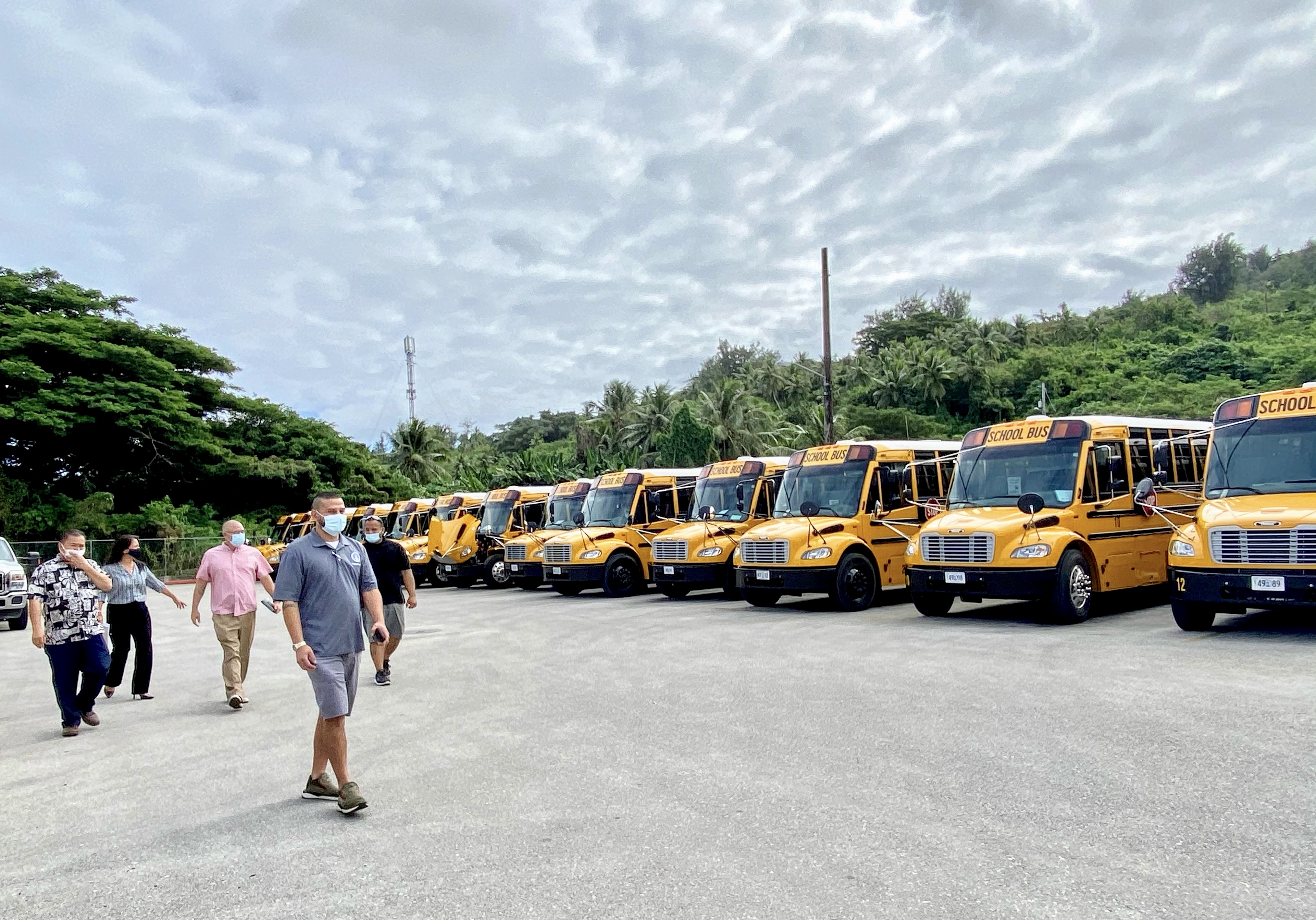 Commissioner of Education Dr. Alfred B. Ada, School Attendance Review Committee Coordinator Robert L. Coldeen III, Office of Pupil Transportation staff member Oswald Quitugua, Board of Education members Maisie B. Tenorio and Gregory Borja conduct a tour of the Office of Pupil Transportation in Lower Base.