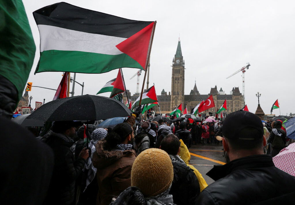 FILE PHOTO: Protesters hold Palestinian flags during a rally to call for a ceasefire, amid the ongoing conflict between Israel and the Palestinian Islamist group Hamas in Gaza, on Parliament Hill in Ottawa, Ontario, Canada March 9, 2024.
