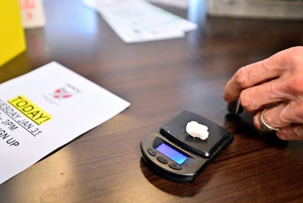 Dave Hamm, an ethical substance peer navigator with the Vancouver Area Network of Drug Users, weighs a piece of rock cocaine as the province of British Columbia decriminalized the possession of small amounts of cocaine, methamphetamine, MDMA and opioids like heroin, fentanyl and morphine, in the Downtown Eastside of Vancouver, British Columbia, Canada, Jan. 31, 2023.