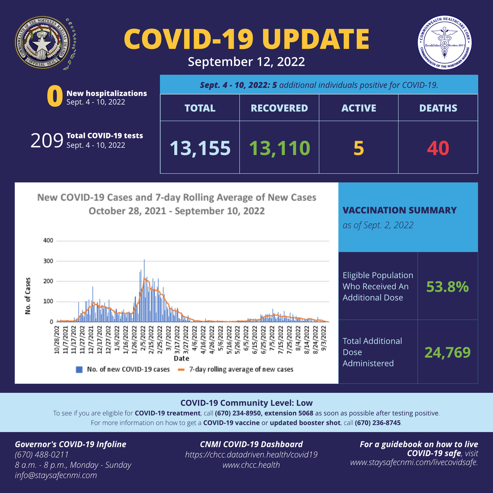 From Sept. 4 to 10, 2022, five additional individuals were confirmed positive for Covid-19, bringing the CNMI total to 13,155 cases. Three cases were identified prior to Sept. 4, 2022.