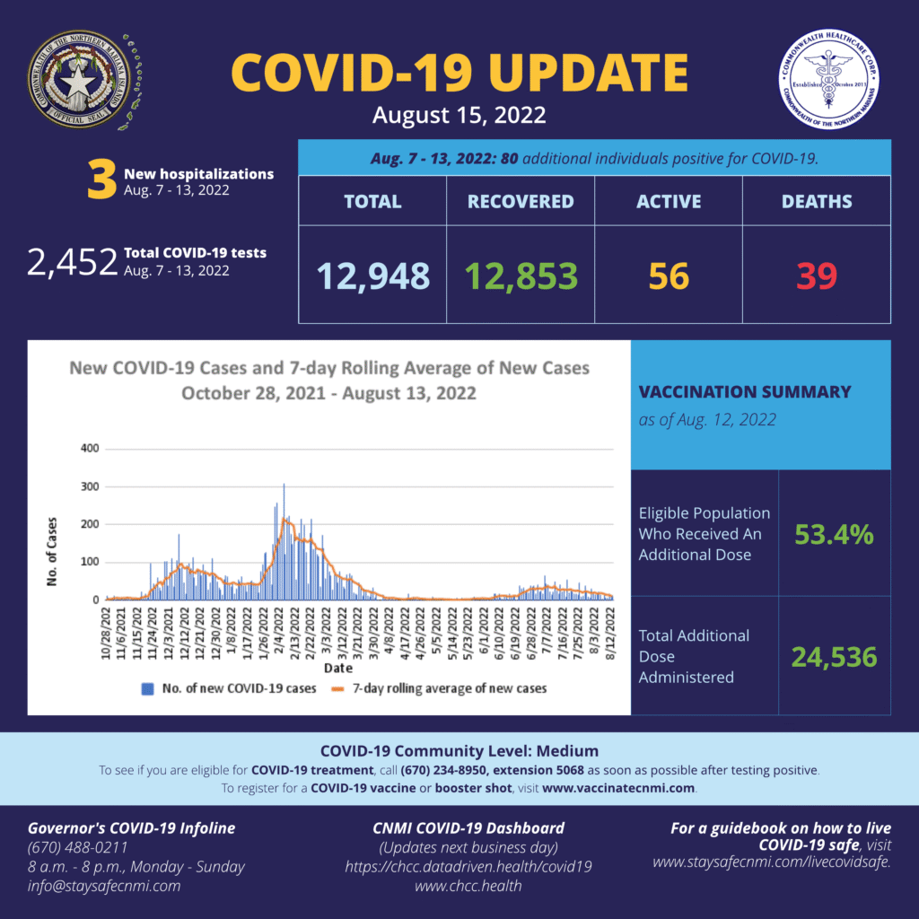 From Aug. 7 – 13, 2022, 80 additional individuals were confirmed positive for Covid-19, bringing the CNMI total to 12,948 cases since March 28, 2020; two were identified before Aug. 7, 2022. Of the cases recently identified: