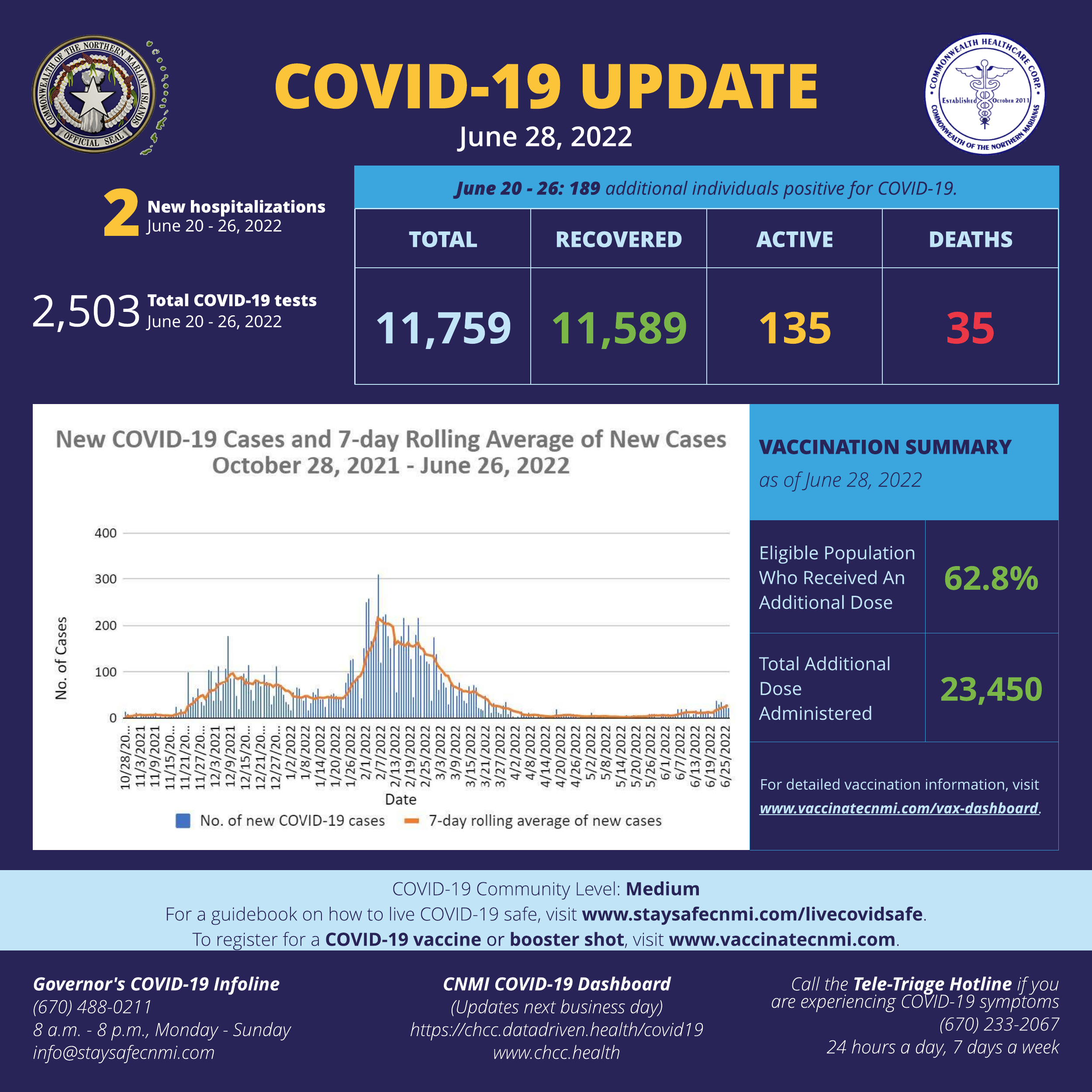 189 additional individuals have been confirmed positive for Covid-19, bringing the CNMI total to 11,759 cases since March 28, 2020.