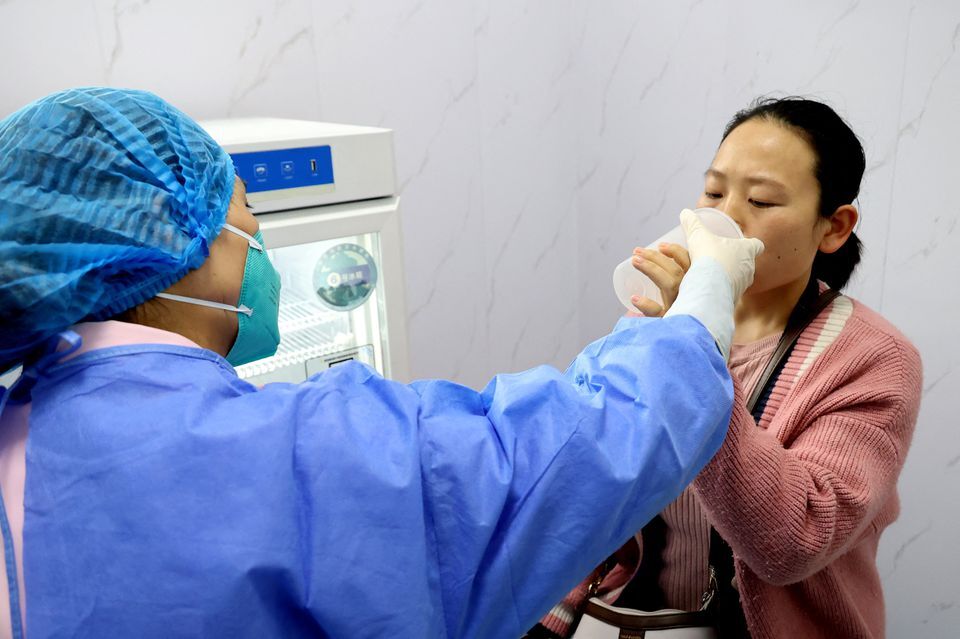 A resident takes an inhaled Covid-19 vaccine produced by Chinese pharmaceutical firm CanSino Biologics, at a community health service center in Lianyungang, Jiangsu province, China, November 3, 2022.