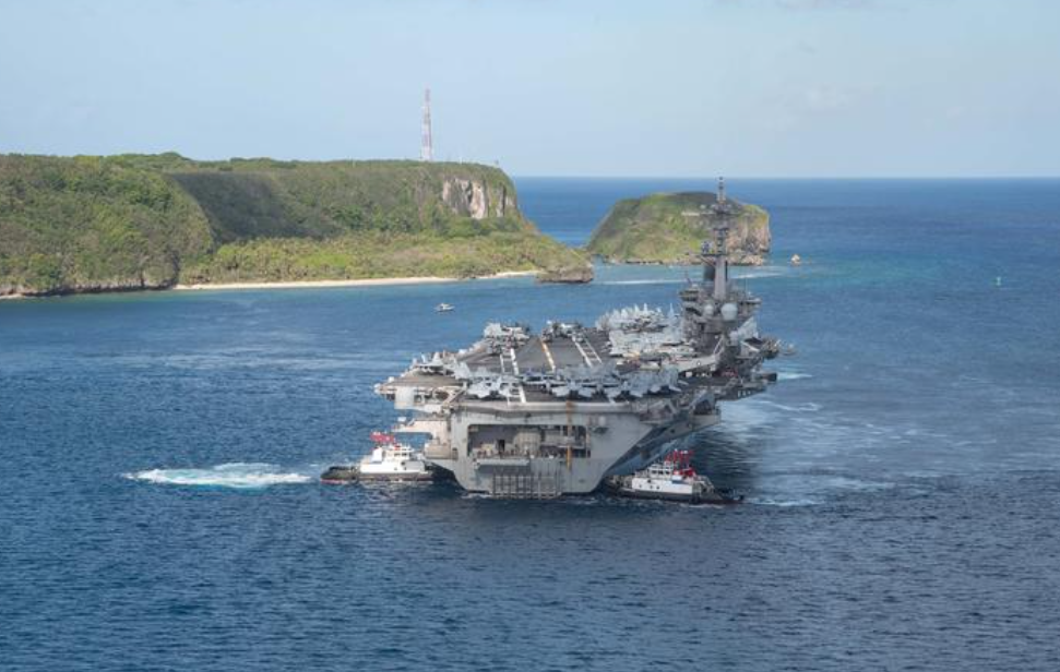 The U.S. Navy aircraft carrier USS Theodore Roosevelt departs following an extended visit in the midst of a coronavirus disease outbreak, from Apra Harbor, Guam on May 21, 2020.U.S. Navy/Mass Communication Specialist Seaman Kaylianna Genier/REUTERS