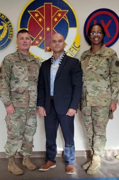 CNMI Office of Veterans Affairs Executive Officer Stanley T. Iakopo meets with Col. Mark W. Siekman, 9MSC commander, left, and Col. Dominique Cummings, DCS G3/5/7.