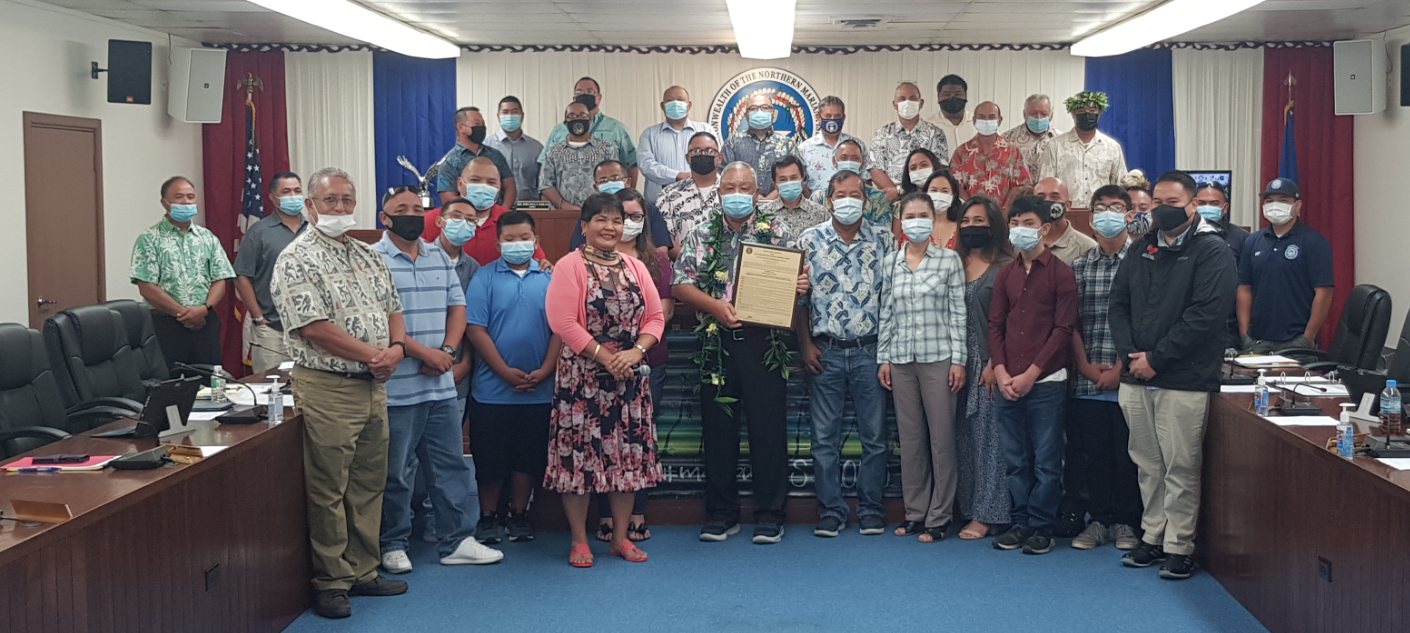 Saipan Mayor David M. Apatang, center, holds a framed copy of House Resolution 21-41 as he poses for a photo with its author, Rep. Janet U. Maratita, friends, relatives, staffers of the mayor’s office and other members of the House of Representatives on Wednesday.
