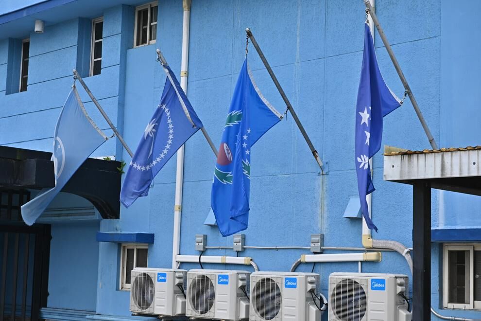 State flags fly at the Federated States of Micronesia Consulate Office Sunday, May 7, 2023, in Harmon. From left, the flags represent the FSM states of Yap, Chuuk, Pohnpei and Kosrae.