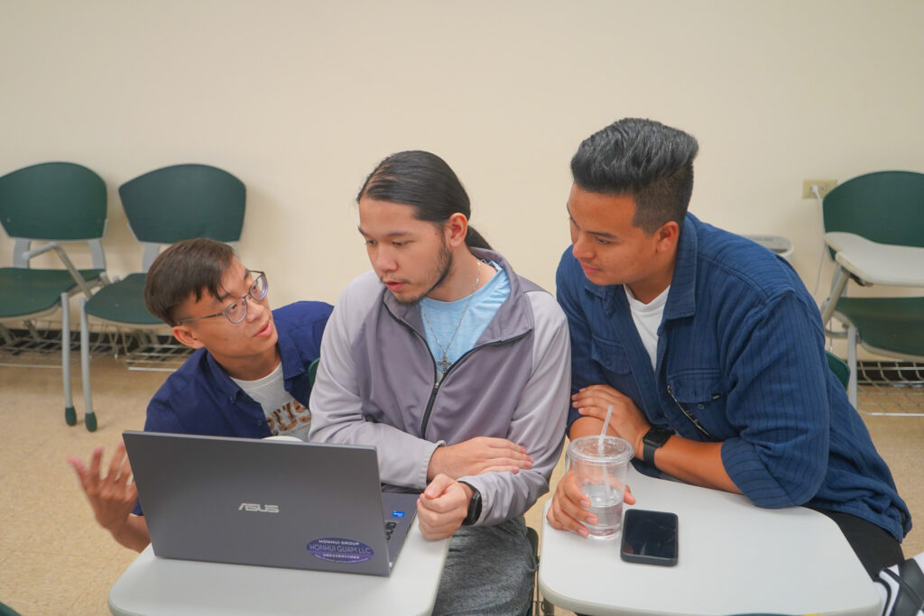 From left, National Pingtung University of Science and Technology’s Noah Lou guides Northern Marianas College students John David Cabrera and Richard Baleares in constructing an interactive agriculture Virtual Reality Experience through 3-D computer software.