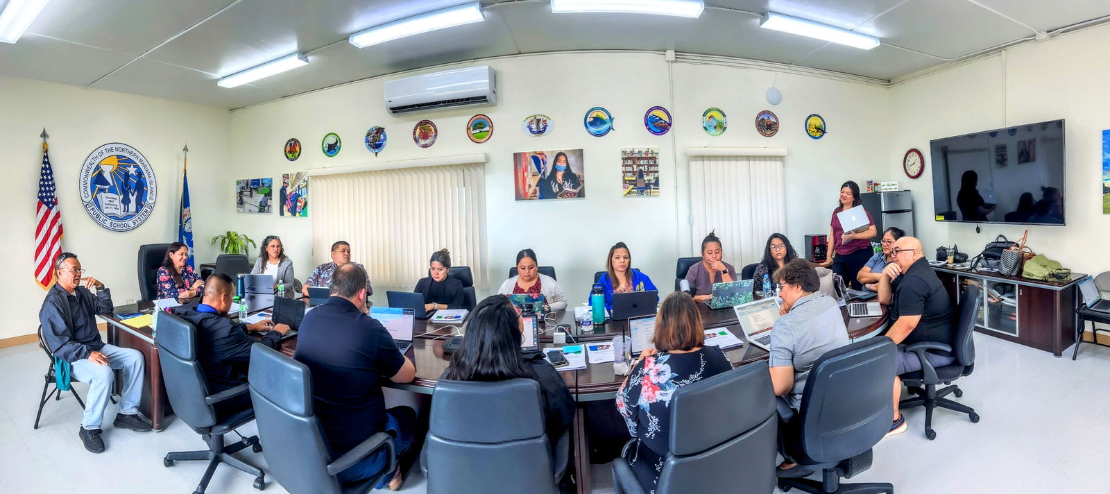Interim Commissioner of Education Donna M. Flores, extreme left, presides over a meeting with the Public School System’s management team Friday afternoon in the PSS conference room on Capital Hill. Also in photo are Associate Commissioner of Education Shawn San Nicolas, Elementary School Principal Representative Paulette Tomokane, Middle School Principal Representative James Sablan, High School Principal Representative Vince Dela Cruz, acting Head Start Director Jolene Sablan, Seniors Directors Jackie Quitugua (Curriculum & Instruction), Dr. Rizalina Liwag (Accountability, Research & Evaluation), Dr. Yvonne R. Pangelinan (Student Support Services), Finance Director Arlene Lizama, Human Resources Officer Lucretia Deleon Guerrero, Family & Community Engagement Program Manager Leila Yumul, Instructional Technology & Distance Education Program Director Lorraine Catienza, Infrastructure Technology Director Jesse Tenorio, acting Special Education Director Nora Fujihira, legal counsel Michael Ernest, and Federal Programs Officer Jacqueline Che.