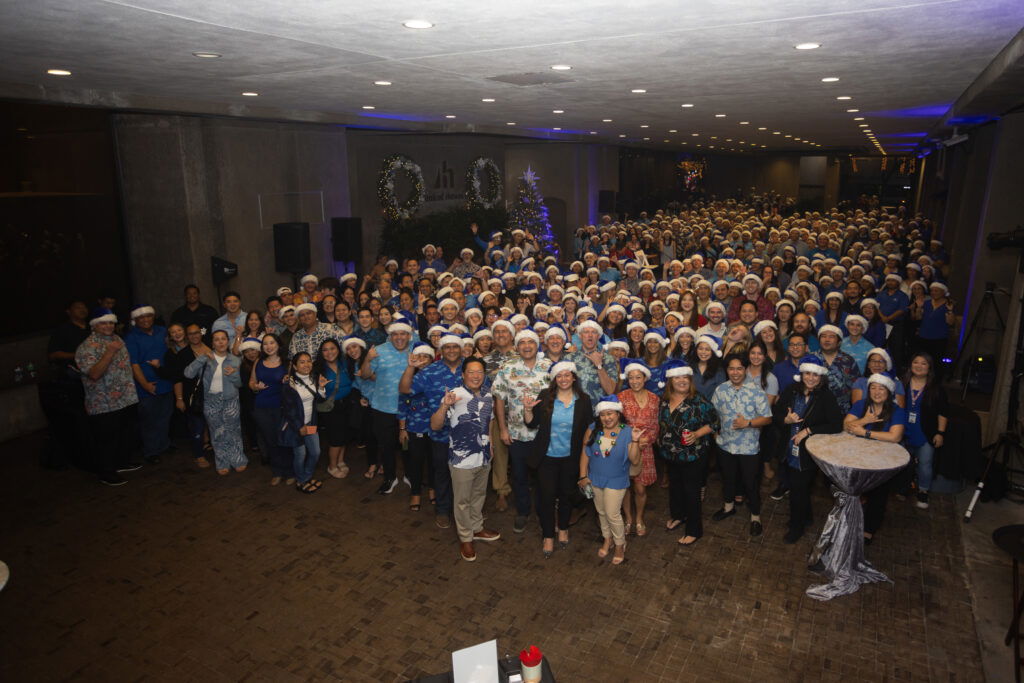 Bank of Hawai‘i Chairman and CEO Peter S. Ho presented a check to Aloha United Way President and CEO John Fink on Wednesday evening, Dec. 11. Nearly 600 employees gathered at the bank’s Main Branch in downtown Honolulu, where the donation was announced at the 13th annual Bankoh Tree Lighting Celebration, which included the bank’s official Christmas tree lighting, trolley rides to enjoy Honolulu City Lights, caroling and holiday treats.