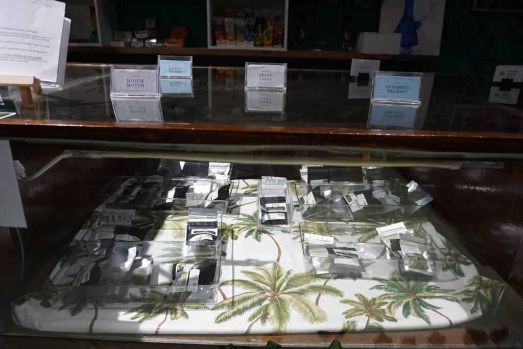 Jamie Hayes, who was taking care of customers at the 420 Lounge in the heart of Garapan when we asked her about her bud recommendations, says she reaches for White Iverson and London Marker because she doesn’t really have “high tolerance.”