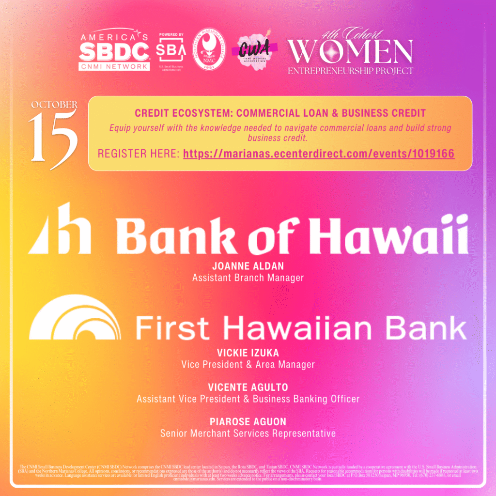 (CNMI SBDC) — The CNMI Small Business Development Center Network at Northern Marianas College, in partnership with the Commonwealth Women’s Association, is excited to announce its speakers for its opening session “Credit Ecosystem: Commercial Loan & Business Credit” of the 2024 Women’s Entrepreneurship Project Cohort 4 training series slated to kick off Tuesday, October 15, 2024 and conclude on Friday, October 18, 2024. The training will be offered at the Northern Marianas College Library at its campus in As Terlaje, Saipan.