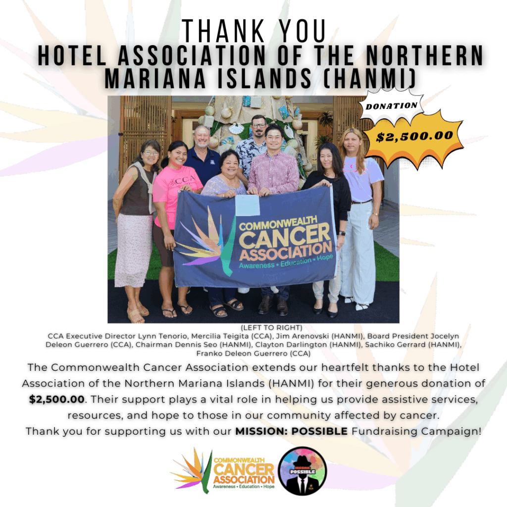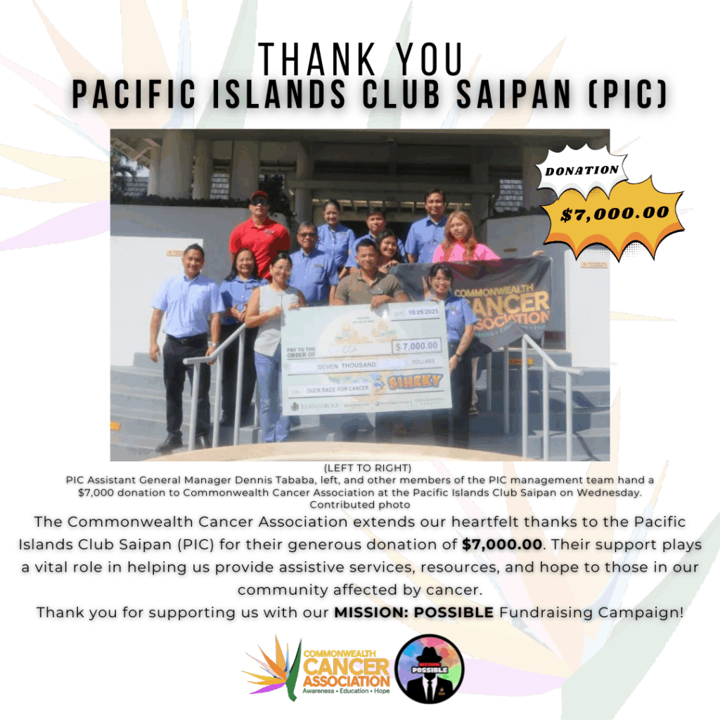 (PR) – The Commonwealth Cancer Association is deeply grateful to the Pacific Islands Club and the Hotel Association of the Northern Mariana Islands for their generous gift towards the group’s Mission Impossible Fundraising Campaign.