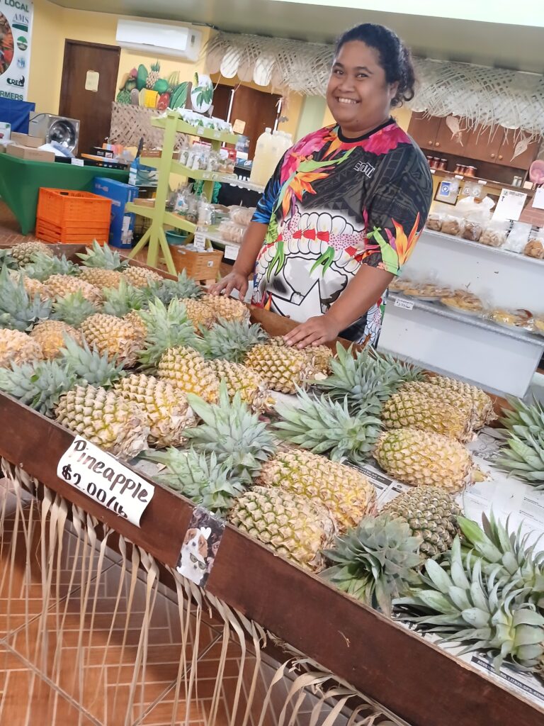 Sweet local pineapples are sold at the Public Coop Market in Garapan, where Karen Tagabuel displays them at $2 per pound. Tagabuel says the pineapples are sweet when they ripen: the outside skin turns yellow. Public Coop Market is on the ocean side of Beach Road across from Horiguchi Building in Garapan.