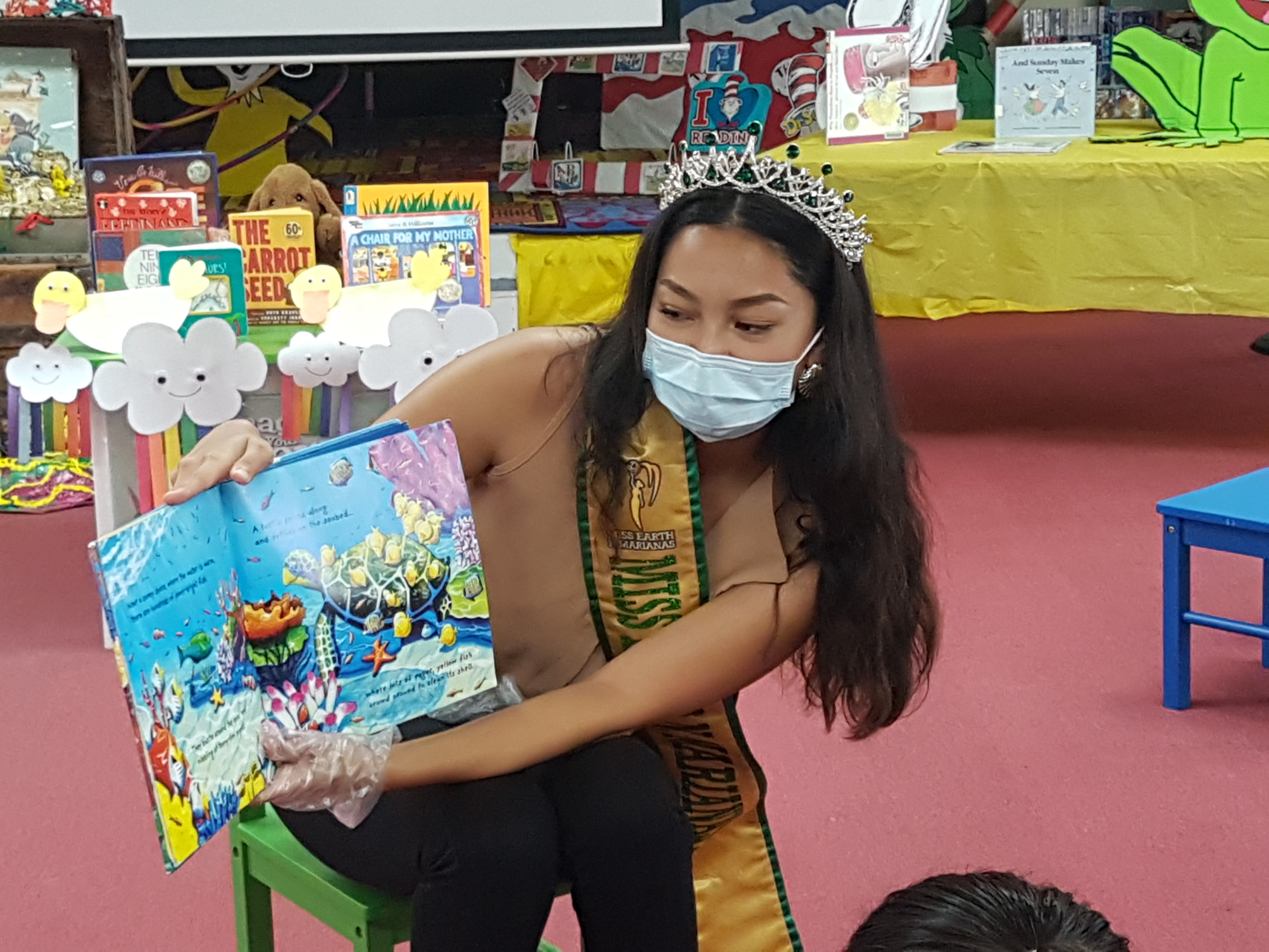 2019 Miss Earth Northern Marianas Leisha Deleon Guerrero read a book to children at Joeten-Kiyu Public Library. JKPL photo