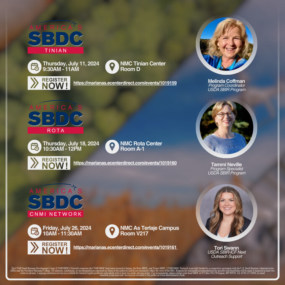 • Melinda Coffman, program coordinator for the USDA SBIR Program, will be facilitating the training at Tinian SBDC on Thursday, July 11, from 9:30 a.m. to 11 a.m. in Room D, Tinian NMC Center.