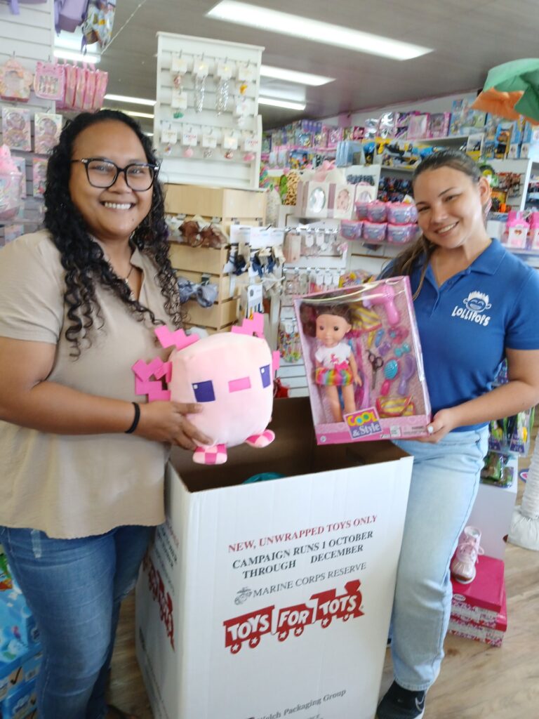 Do you want to brighten in the CNMI a child’s Christmas? The Toys for Tots program is again soliciting toys for children of economically challenged families in the CNMI. Lollipops Store in Garapan is selling toys with 25% discount for toys for the program. Lollipops is open Monday through Saturday, 9 a.m. to 7 p.m., and Sundays, 10 a.m.-4 p.m. The friendly and helpful staff is ready to help you. In photo are Keolani Ngiracheliong, left, and Charlotte Castro.
